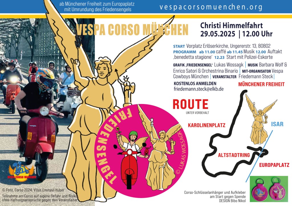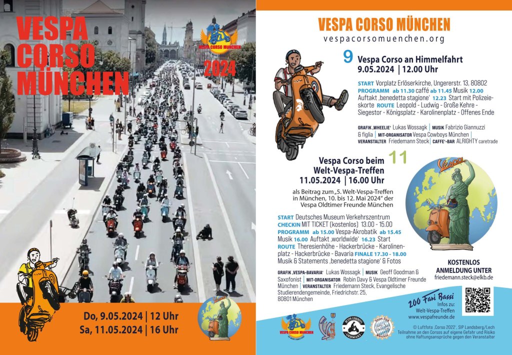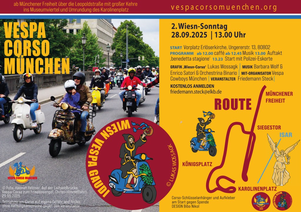 Die Route für den Benefiz-Corso führte in den Schmuckhof der Munich RE, Königinstraße, eine fabelhafte Kulisse für das Corsofinale. Jugendstilkirche – Klinik – Siegestor – Schmuckhof waren die Stationen. Im Wirtshaus Bachmaier Hofbräu fand anschließend eine „Vespa-Leo-Party“ statt, mit einer Benefiz-Tombola und einer Spendenaktion. Die drei großen Münchener Vespa-Clubs organisierten mit. Der Vespa Shop Schwabing war nicht nur mit federführend in der Ausrichtung der Tombola, sondern auch mit großer Spende beteiligt. Das Gastwirt Hugo Bachmaier gab eine großzügig Spende. Tombola-Preise steuerten sehr großzügig, S.I.P. Scootershop Landsberg, die Vesparia Gräfelfing und die Gronsdorf Vespa Garage bei. Die Pfaffenhofener Straßenbaufirma Schelle hatte im Spätsommer nicht nur die Baustelle am Münchener Siegestor soweit vorangetrieben, dass der Corso dort die große Kehre fahren konnte, sondern auch einen namenhaften Geldbetrag gespendet. Radek Bogacki (‚Raab-Einrahmungen‘, Fraunhoferstr) hat die Einrahmung und Ausstellung des Benefizbilds in der Kinderklinik großzügig unterstützt. Siegfried Wameser fuhr in der Oldtimer Ape Calessino mit und fotografierte den Corso in voller Fahrt. Grazie di cuore a tutti.